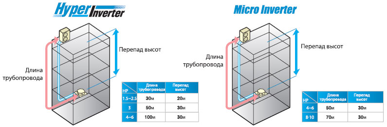 Длина труб может составлять до 100 м (для моделей 4-6 л.с., Hyper Inverter).